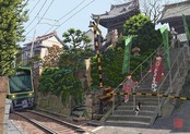 源義経の腰越状で有名な満福寺。前を横切る江ノ電とともに描きました。