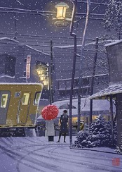 しんしんと雪が降る国分寺街道の夜を描きました。