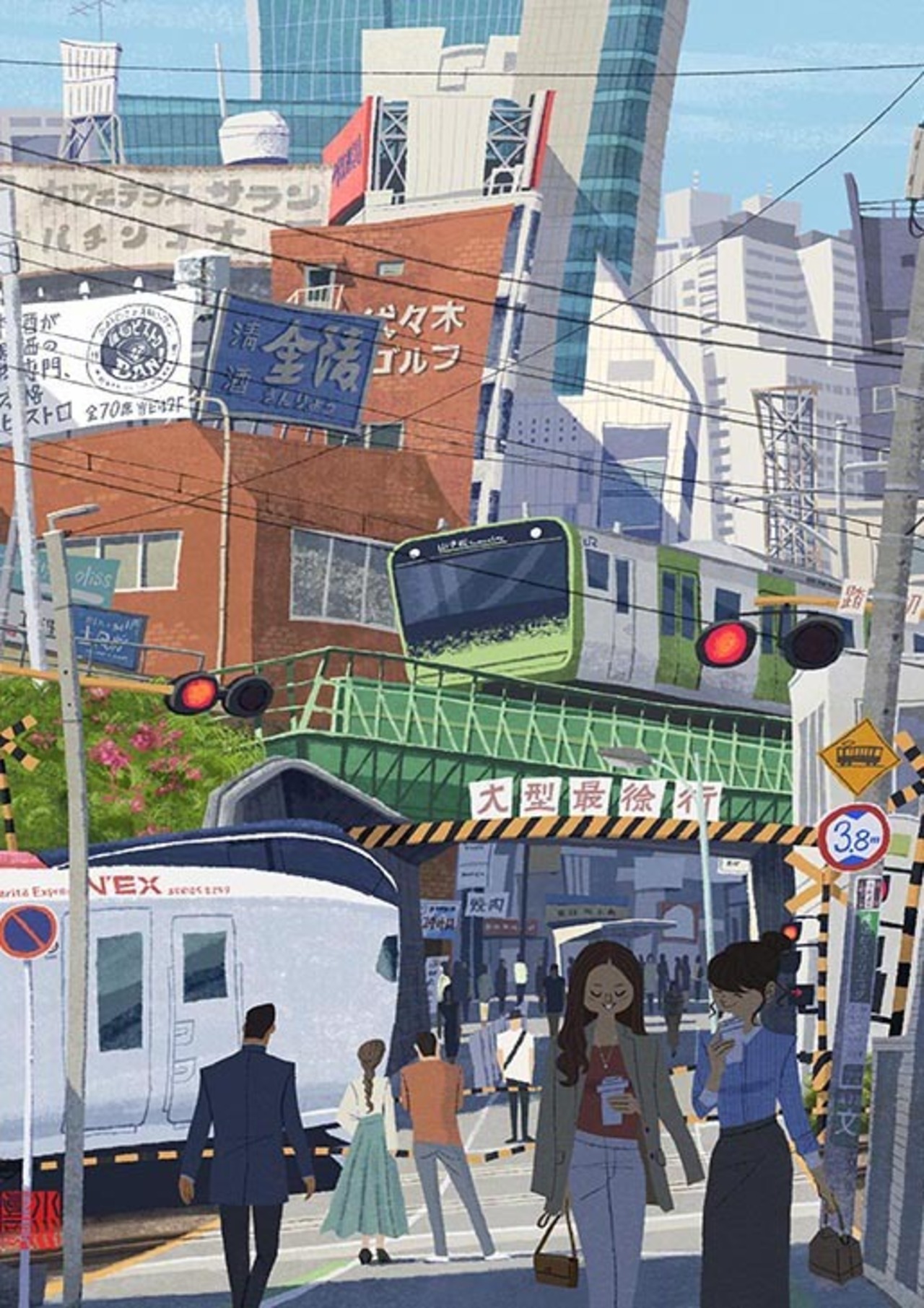 東京都心に残る踏切と雑踏の日常風景を描きました。