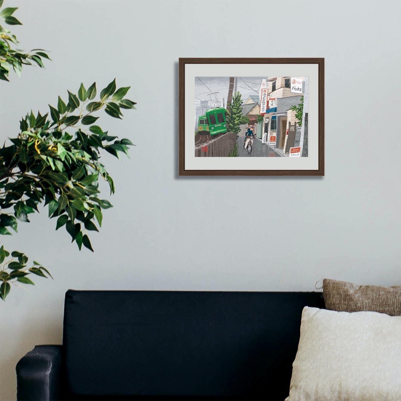 額装ジークレー版画『世田谷線・雨の松陰神社前』八切りサイズ