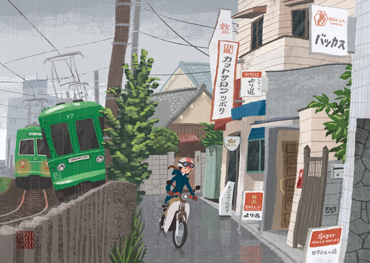 小さな商店が並ぶ線路沿いの細い路地。沿線の生活に溶け込む世田谷線。旧型車両が走っていた頃の風景を描きました。