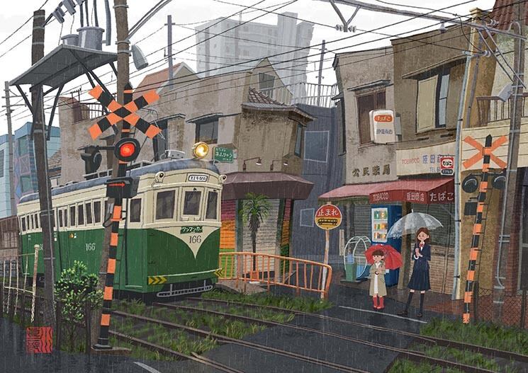 大阪唯一の路面電車。古い車両と飾らない下町風景の取り合わせに魅力を感じ、絵にしました。