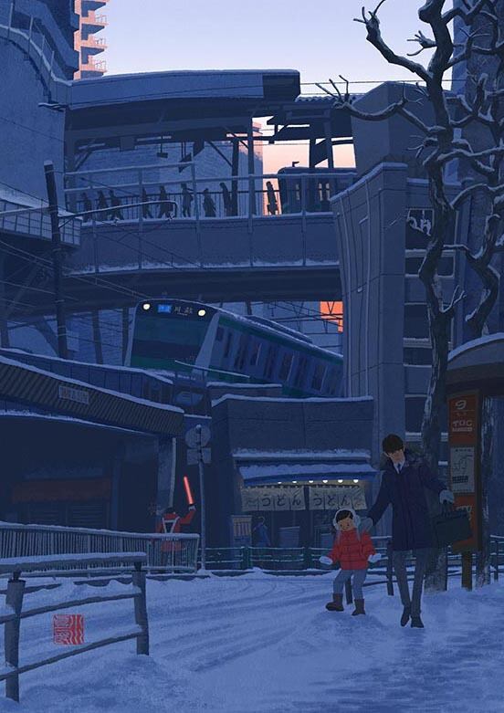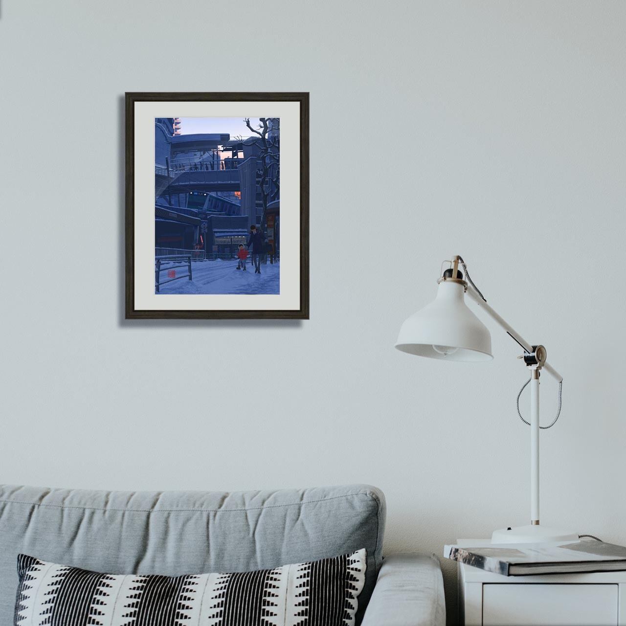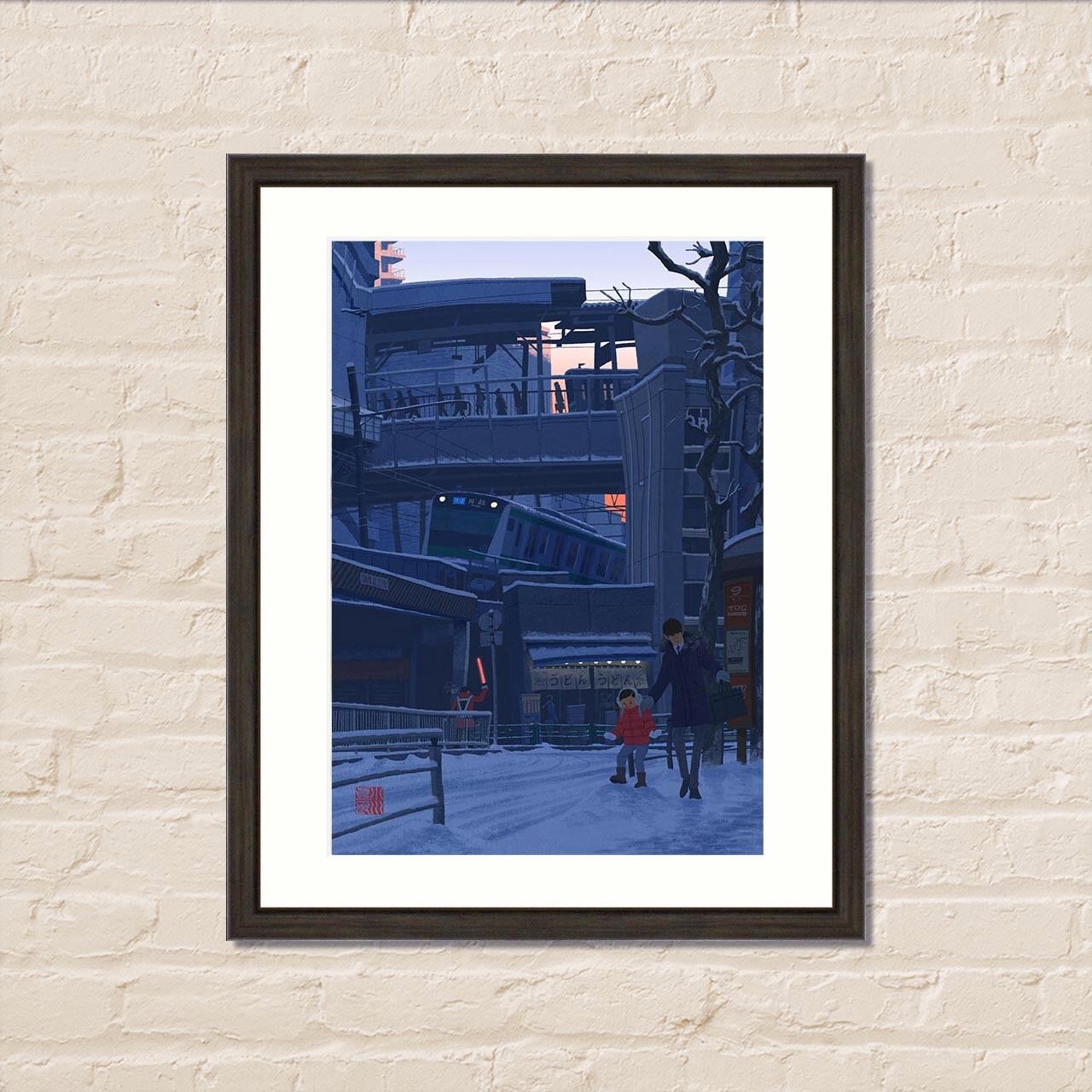 額装ジークレー版画『五反田駅西口・雪の朝』八切りサイズ