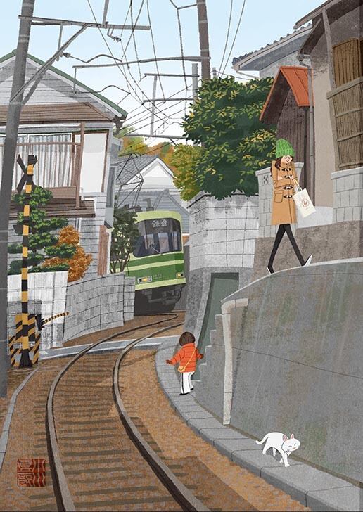 住宅街を縫うように走る江ノ電を描きました。