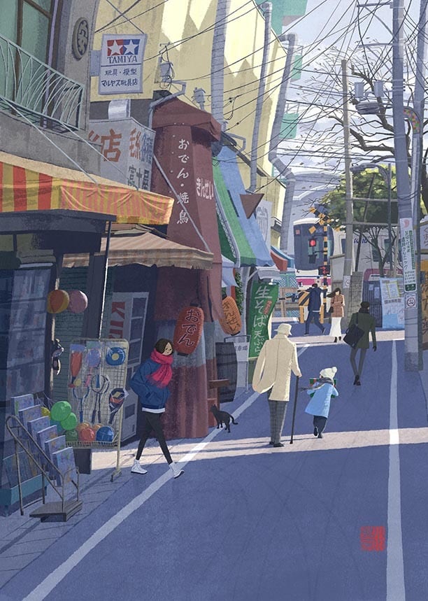 玩具屋さんのあるささやかな駅前商店街を描きました。