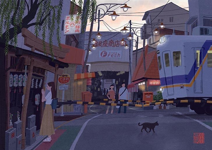 大阪を走る「大都会のローカル線」南海汐見橋線と、ノスタルジックなアーケード商店街を描きましたを描きました。