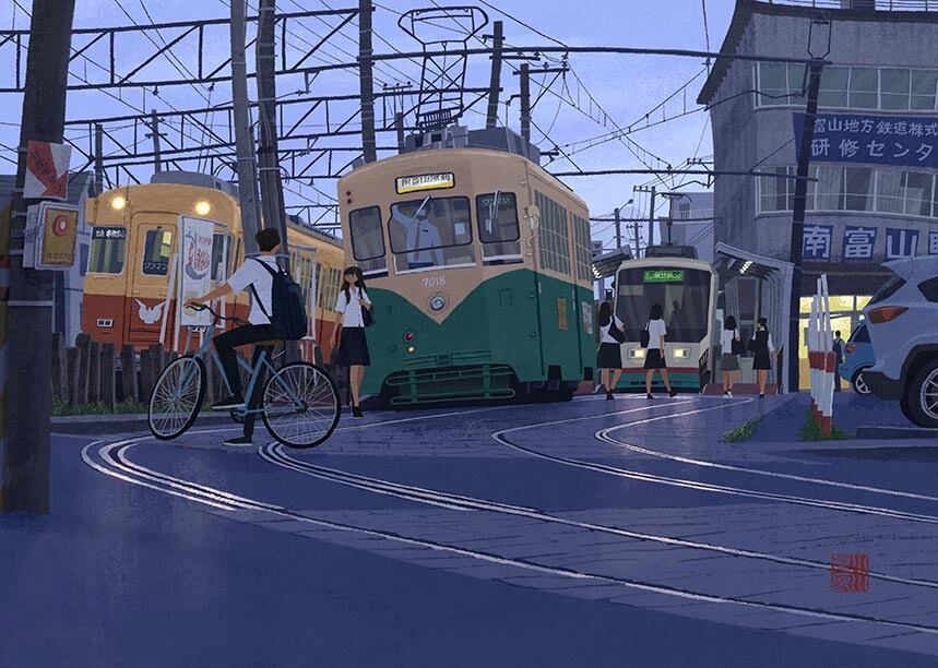 鉄軌道王国の乗換駅。懐かしい空気に包まれた駅前風景を描きました。