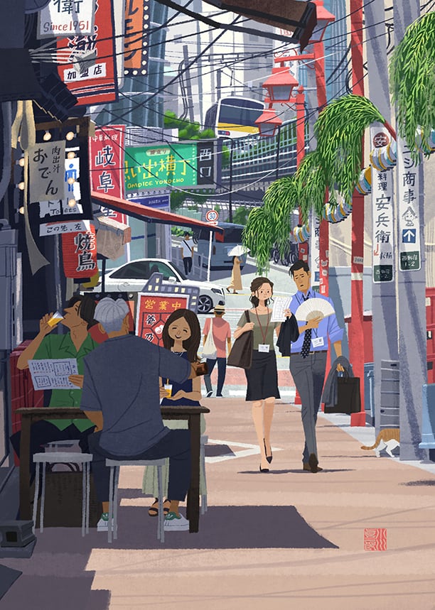 外国人観光客にも人気の古い飲み屋街。真夏の風景を描きました。