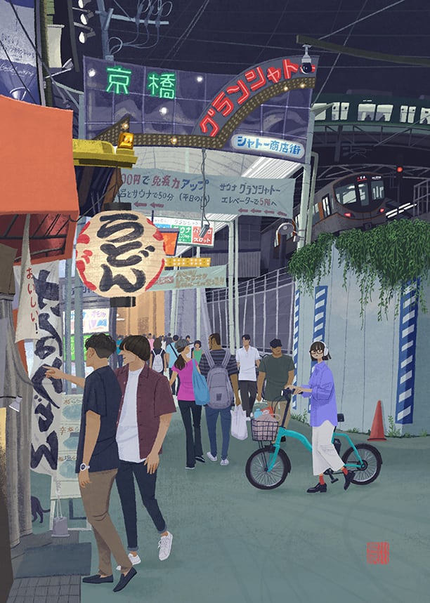 大阪第四の繁華街・京橋を描きました。東口は大阪らしい雑然とした魅力に溢れています。