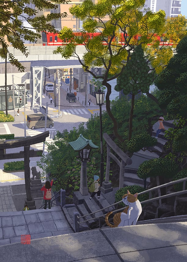 東海道北品川宿の鎮守、品川神社から見た京浜急行新馬場駅付近の風景です。品川境内には都内最大の富士塚があり、石段の中腹から始まる登山道を行けば、気軽に「富士登山」を味わえます。