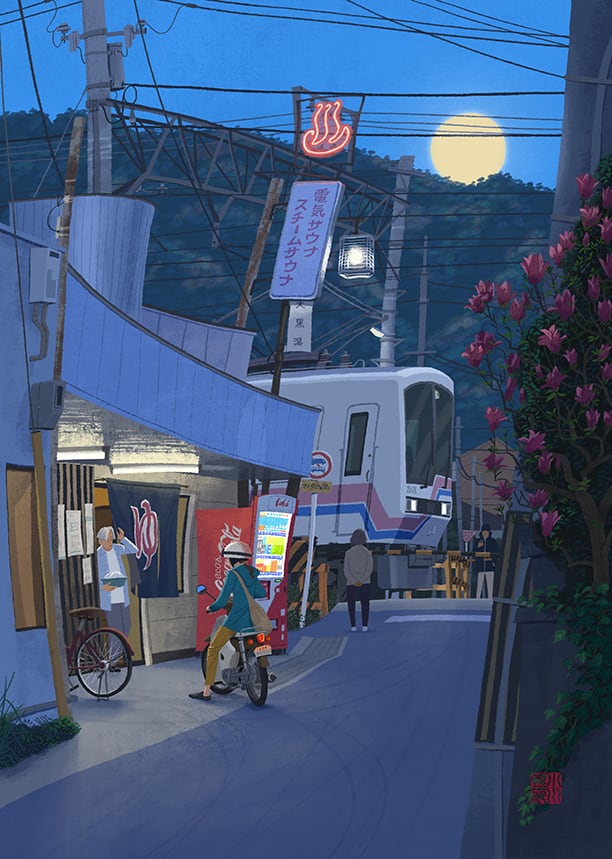 銭湯のある踏切。春の宵です。